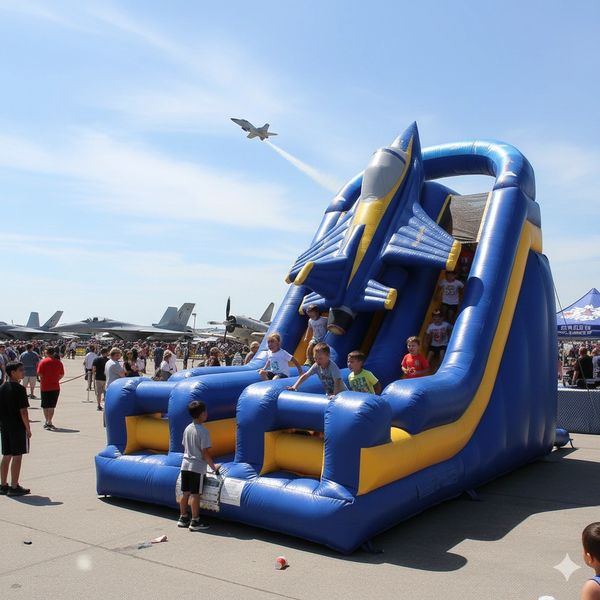 Perfect for any air show or community event, this impressive inflatable captures the thrill of aviation with the iconic blue and yellow livery of the legendary Blue Angels. Standing 18 feet tall, it guarantees an exhilarating, fast-paced descent. The dual lanes allow two riders to race side-by-side, maximizing throughput and fun. This showstopping attraction is a must-have for families looking for high-flying entertainment. Get ready for a thrilling, high-G-force experience right on the tarmac!